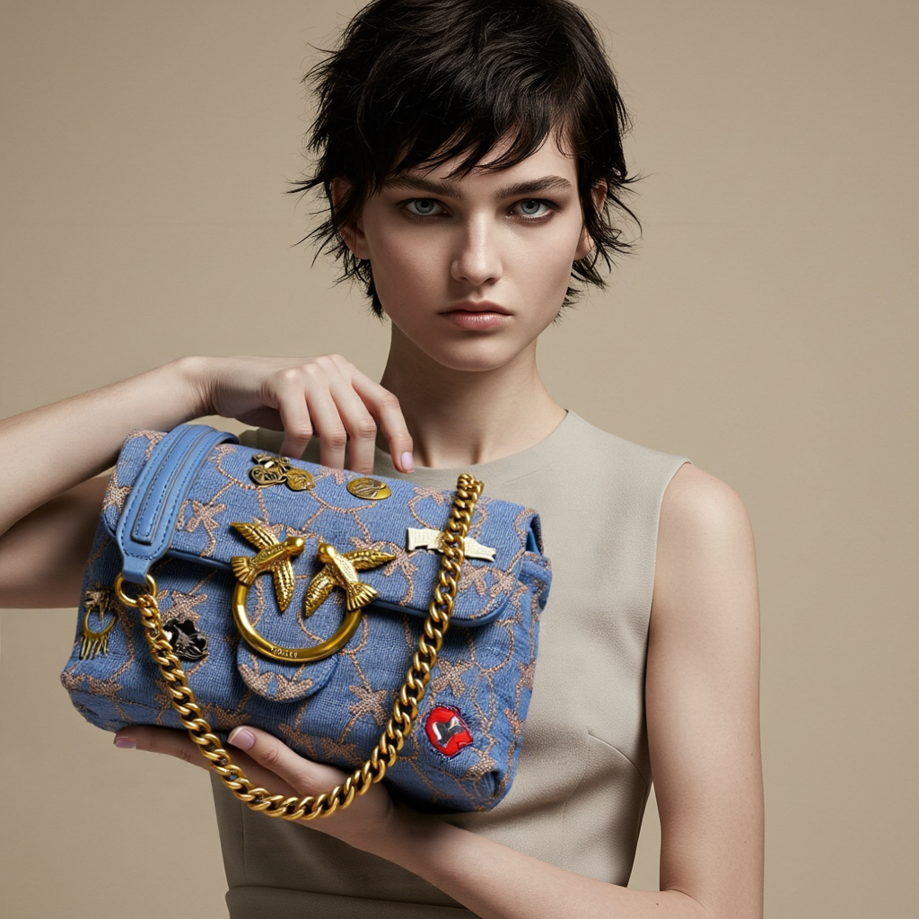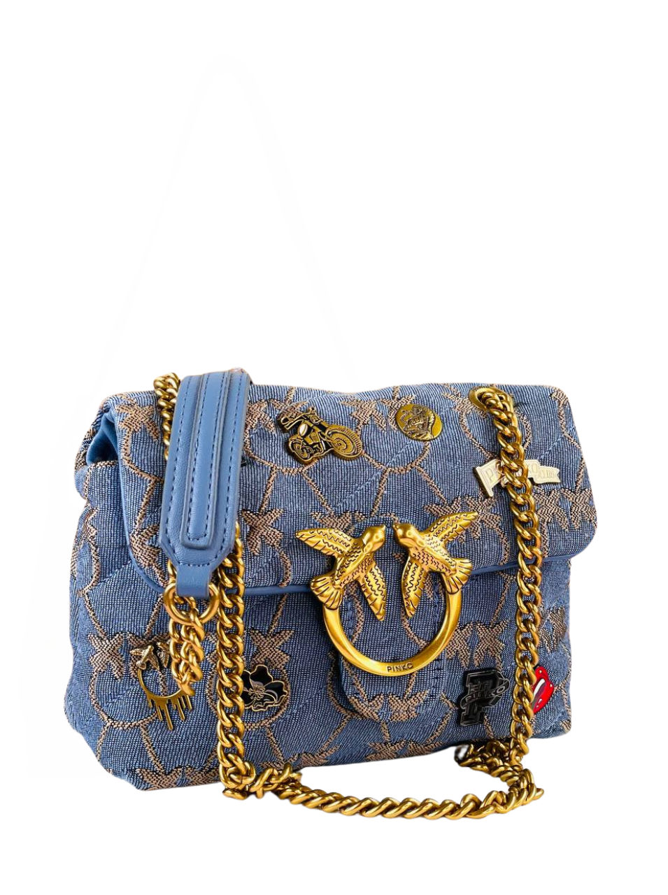 This unique Pinko Love Bag is crafted from stylish blue denim, detailed with intricate embroidery and charming symbols. It features a bold, thick gold-tone chain strap and the brand's iconic Love Birds buckle on the front. Adorned with chic embellishments and modern patches, this bag has a distinctive and fashionable personality. Its practical design is perfect for carrying your daily essentials while adding a touch of bold elegance to any outfit.