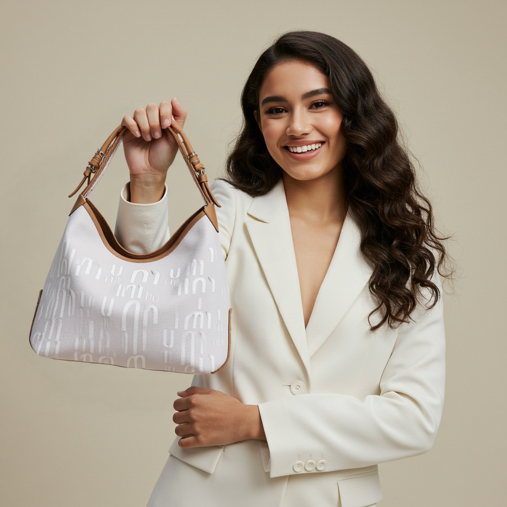 Immerse yourself in a world of classic elegance with a modern twist. The "Symphony" Shoulder Bag is a work of art designed to highlight your refined taste. Crafted from a luxurious light beige canvas, this bag is adorned with iconic embroidery that carries the brand's signature, giving it a distinctive and luxurious character.