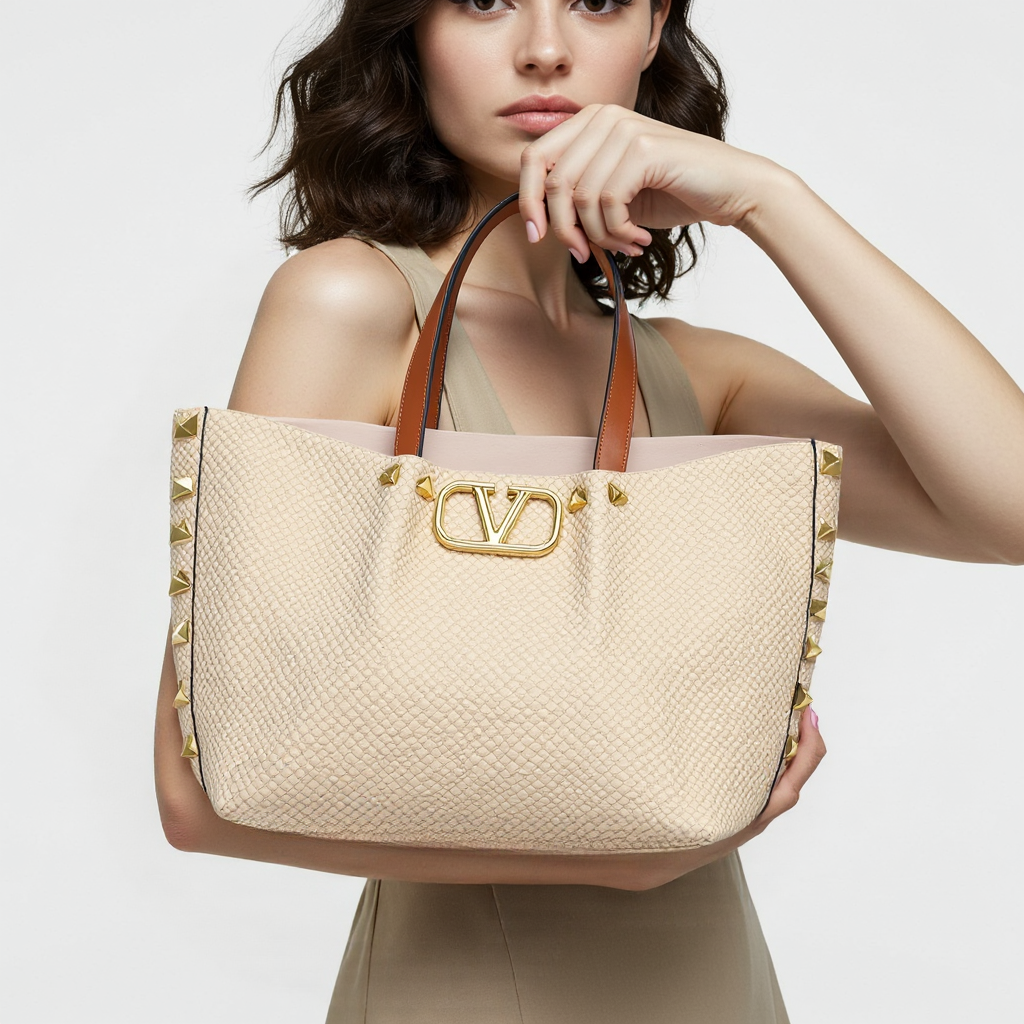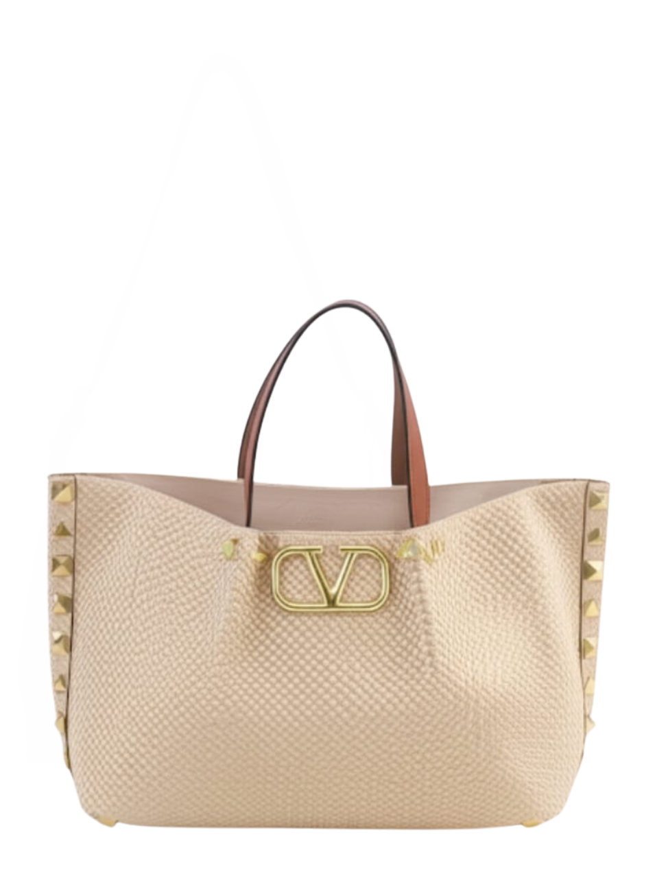 This exquisite Valentino Garavani tote bag blends natural charm with sophisticated elegance. Crafted from beautiful raffia, its spacious design is perfect for everyday use, whether you're heading to the beach or a stylish brunch. The bag features the iconic VLogo Signature in gleaming gold-tone metal, beautifully complemented by the brand's signature pyramid studs along the sides. The sturdy leather handles offer comfortable carrying, making this a perfect accessory to elevate any look